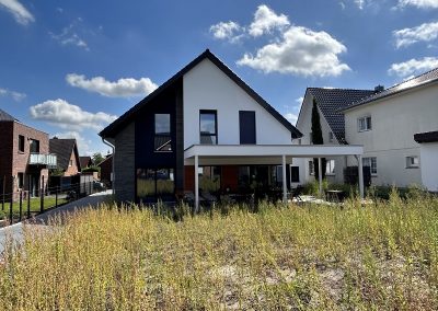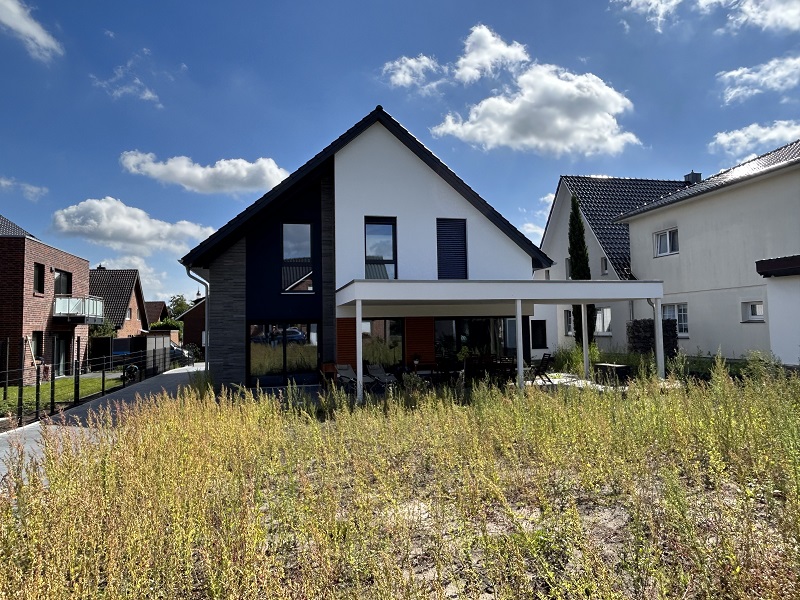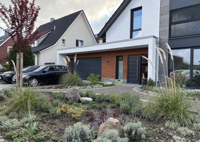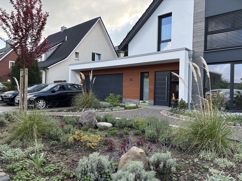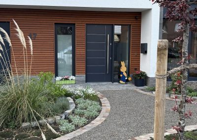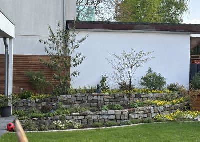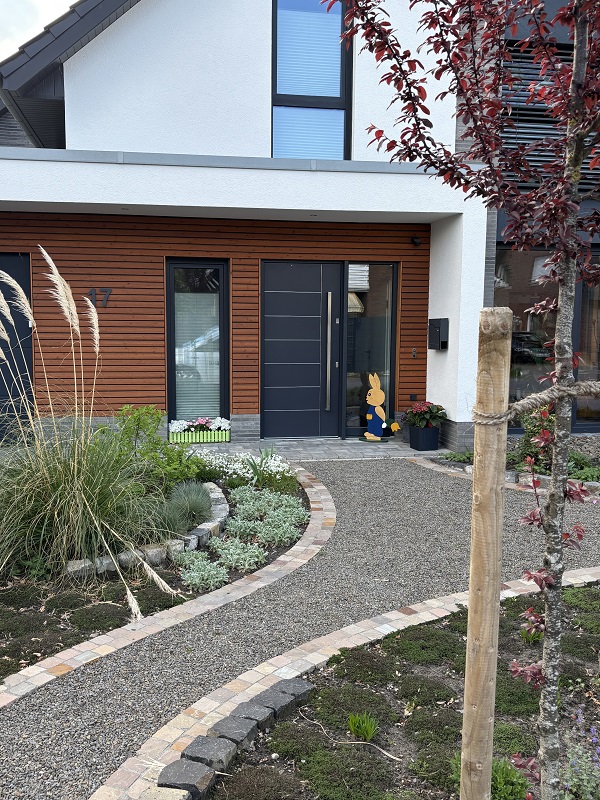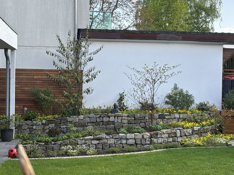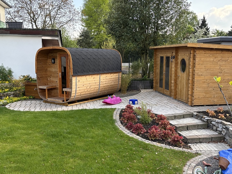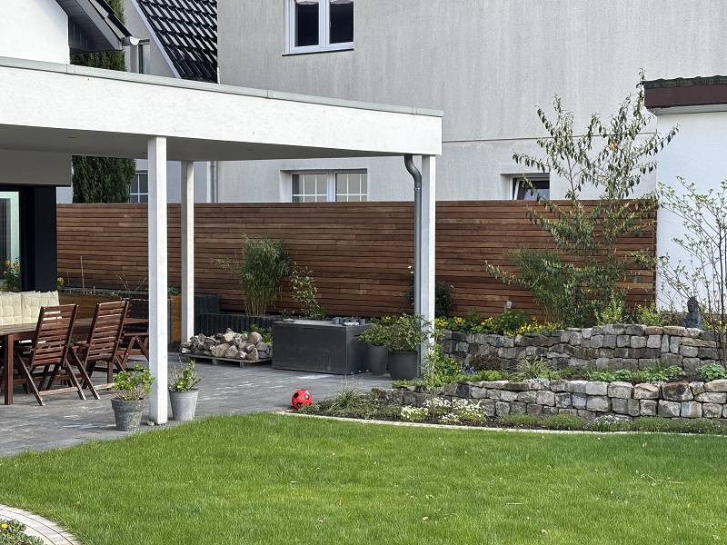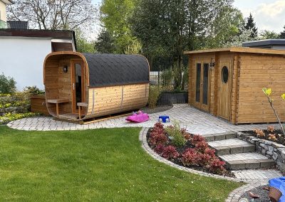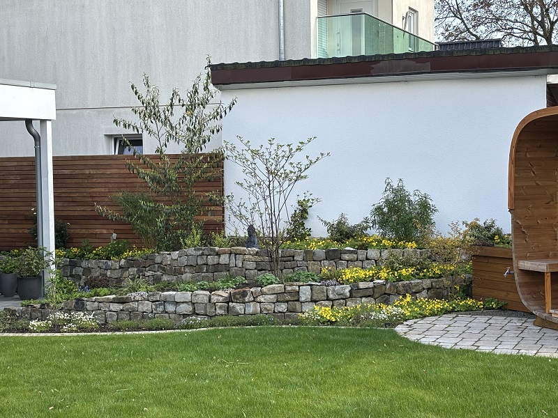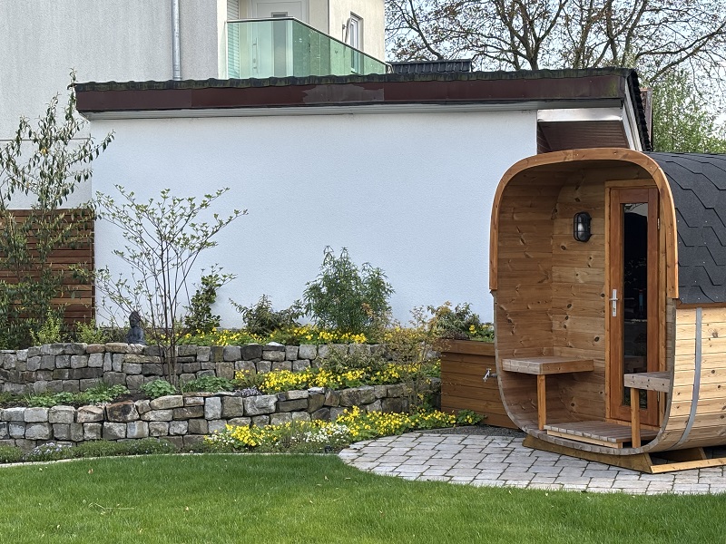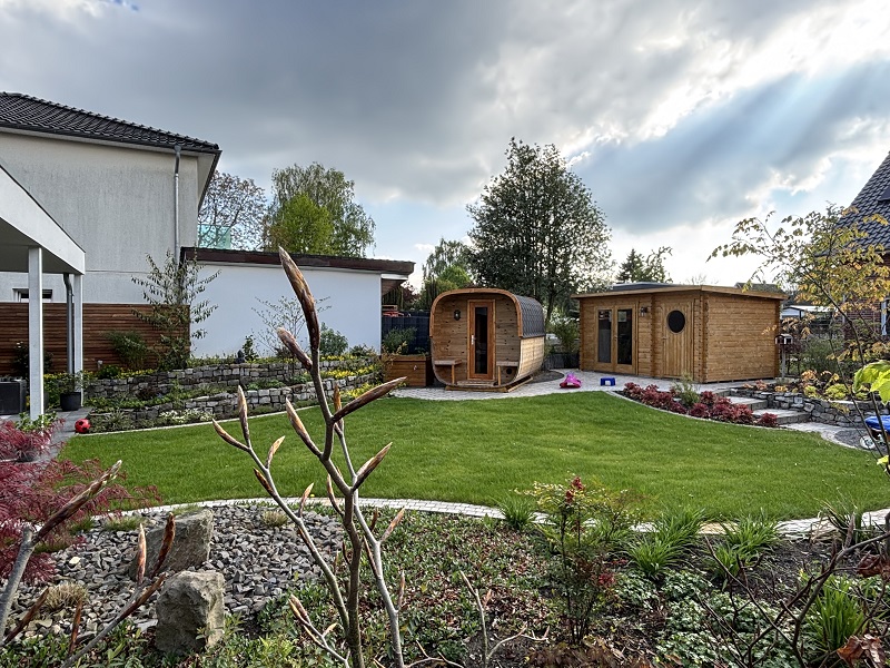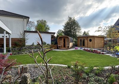 Ein ganz besonderer Garten für ganz besonders liebe Menschen. Wenn man Vertrauen schenkt, entstehen die besten Lösungen. Fasssauna, Hütte, versenkter Sitzplatz – viel war bei der Planung zu integrieren. Die Höhenverteilung im Garten ist dabei sehr gelungen.